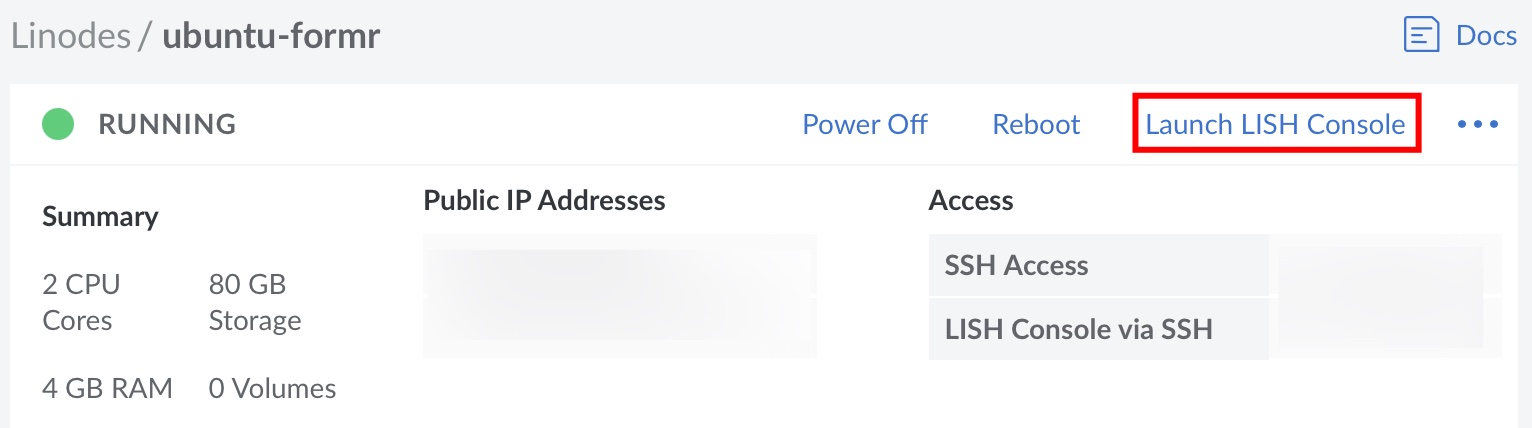 Once you have created your Linode server, you’ll see it in the “Linodes” section. Click on it to make sure it’s properly running. On top right corner, you’ll see a “Launch LISH Console” button, where LISH is short for Linode Shell. By clicking on it, you’ll open the online shell command terminal.
