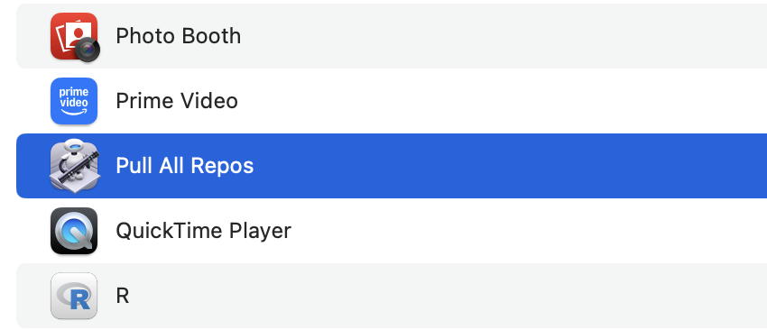- Save it as an application and move it into your “Application” folder. Mine has the name being “Pull All Repos”.