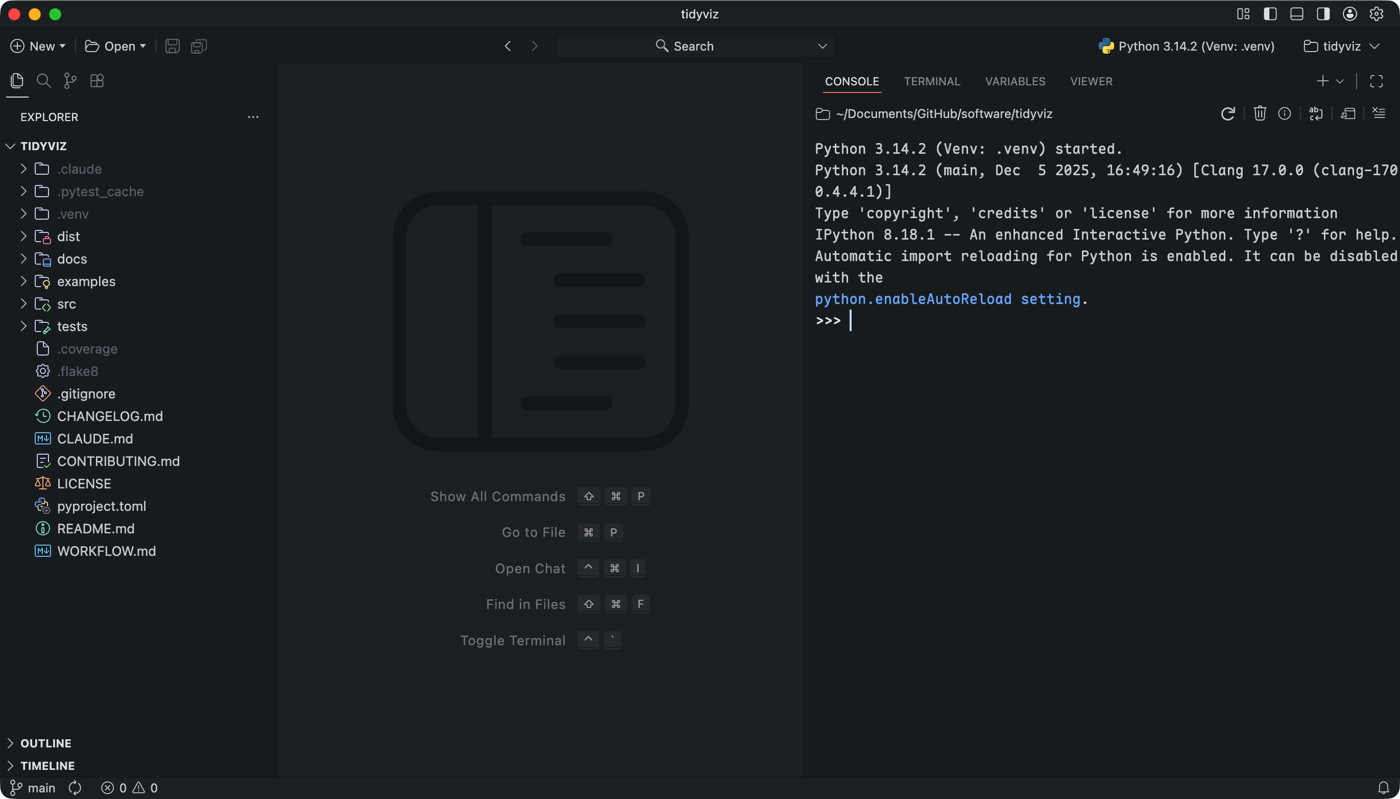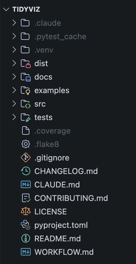 from tidyviz import vizThe docs/, examples/, and tests/ directories are all self-explanatory. The root directory contains metadata files like README.md, CHANGELOG.md, LICENSE, and pyproject.toml which is the configuration file for building and packaging the Python package.