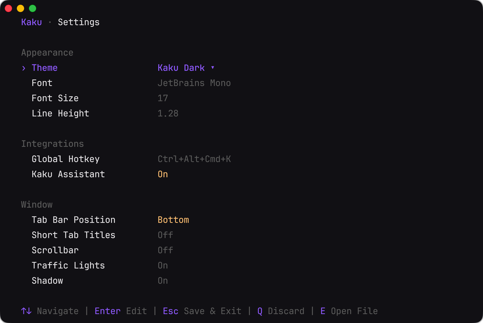 Kaku supports a wide range of settings and can be triggered using the kaku config command. You can also cooperate with Claude Code to directly edit the related setting files like starship.toml and yazi.toml. If you are not familiar with these files just ask Claude Code.