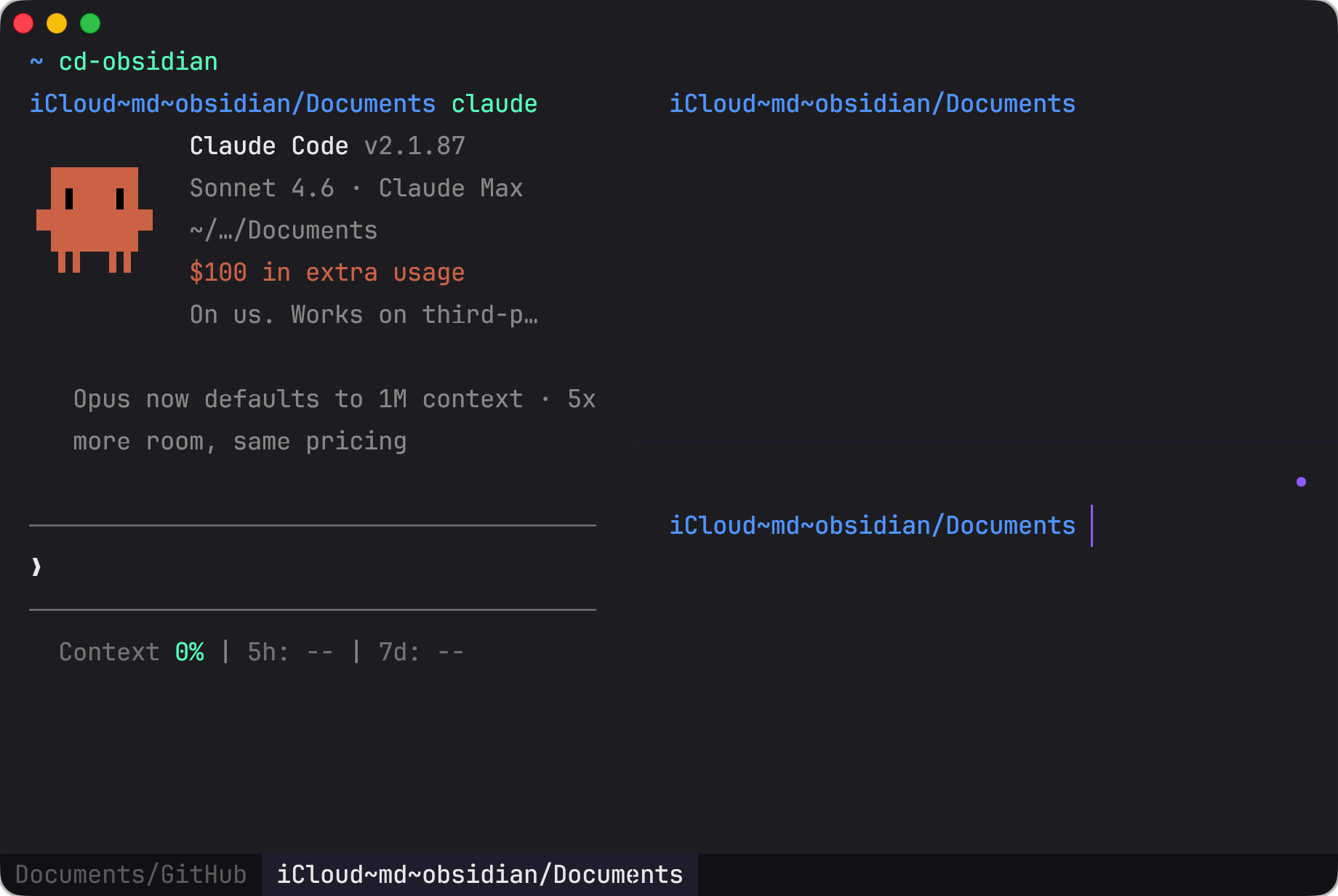 Kaku also supports multiple tabs and panels. In the above example, I opened an Obsidian tab and a GitHub tab, and have 3 panels in the Obsidian tab.