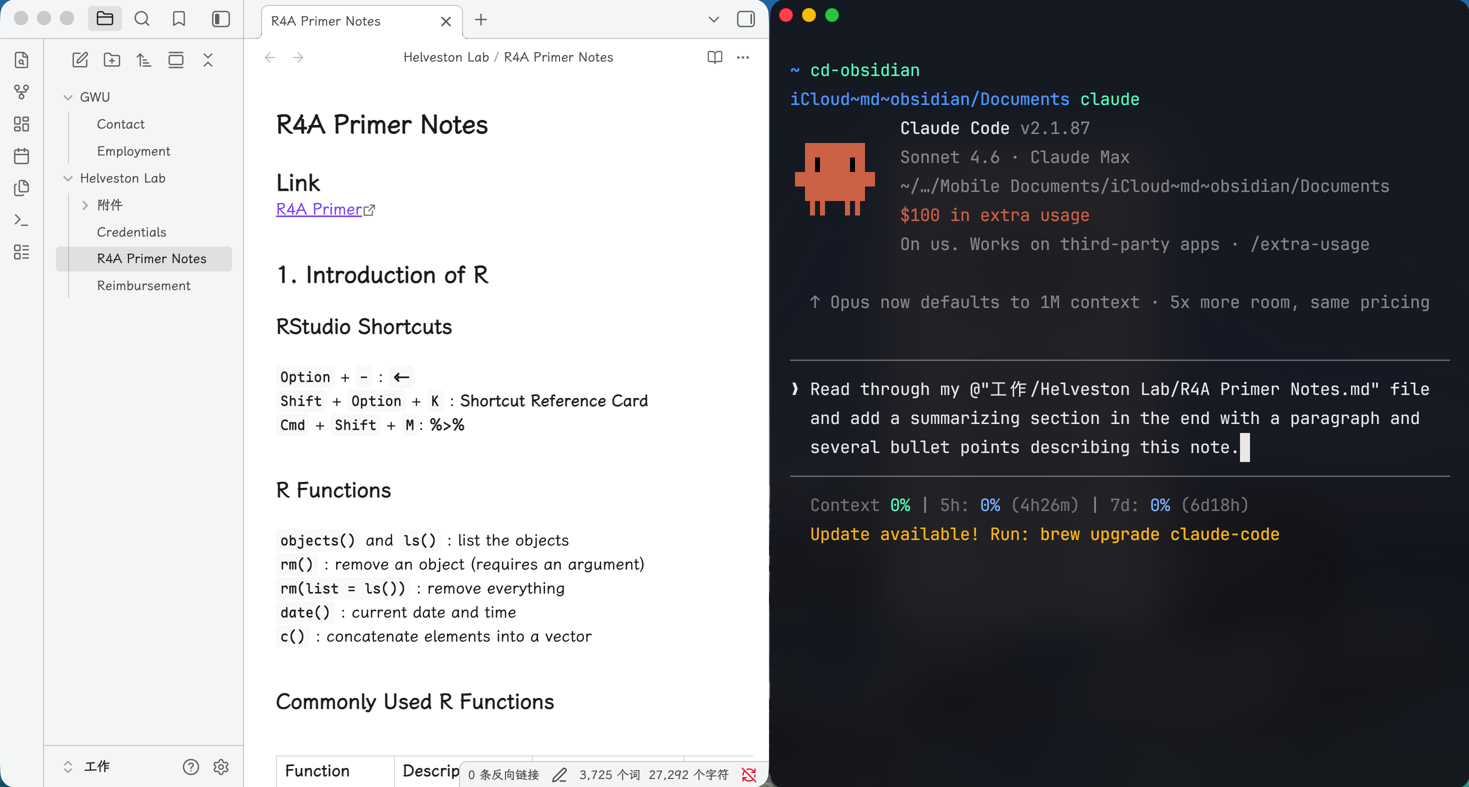 The screenshot above shows two tabs, Obsidian and GitHub, with three panels open inside the Obsidian tab.