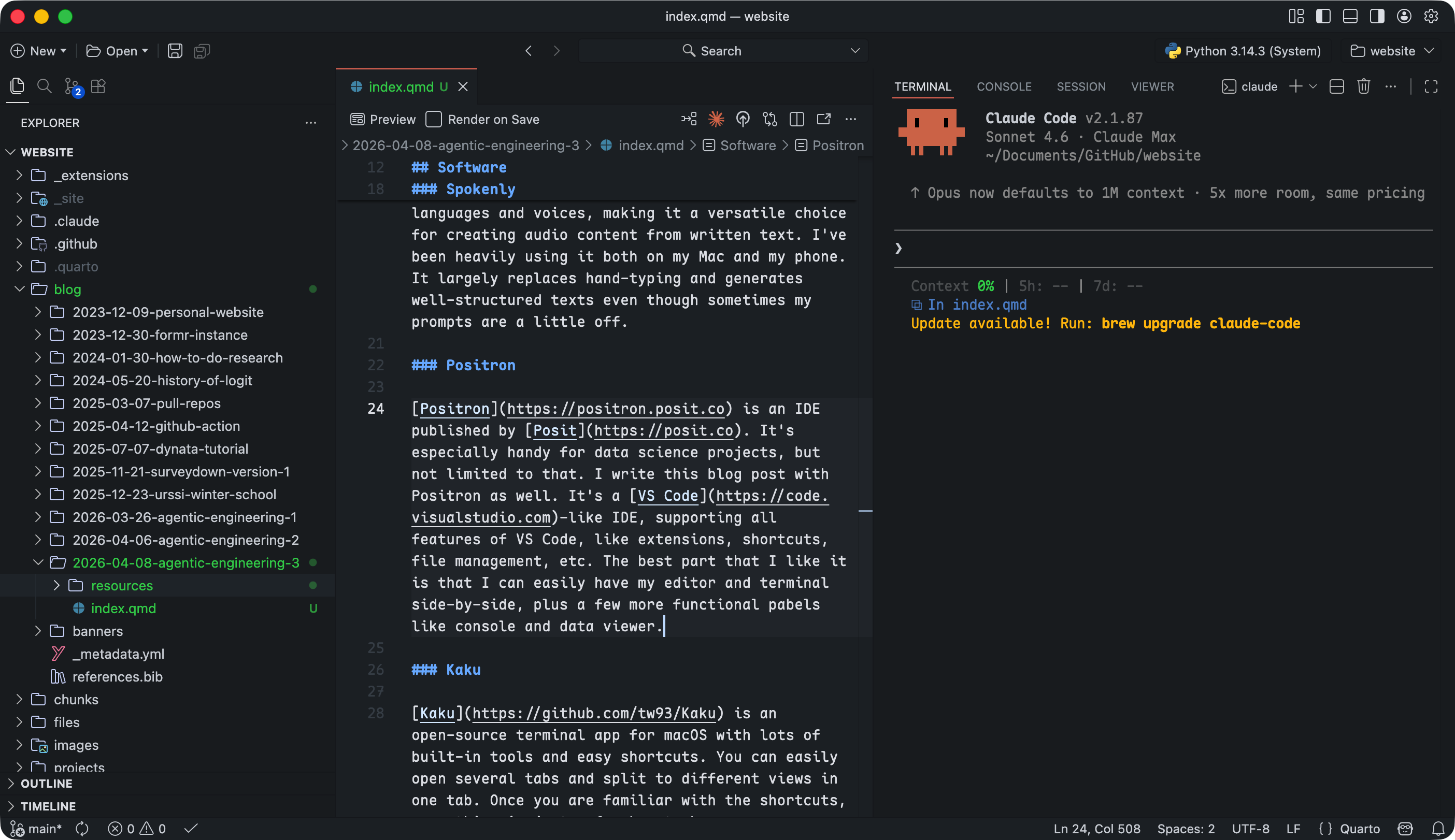 Positron is an IDE from Posit, built for data science but comfortable for general development. I’m writing this post in it. It runs on VS Code’s foundation, so extensions, shortcuts, and file management all work the same way. What I value most is having the editor, terminal, console, and data viewer open at the same time without switching windows.